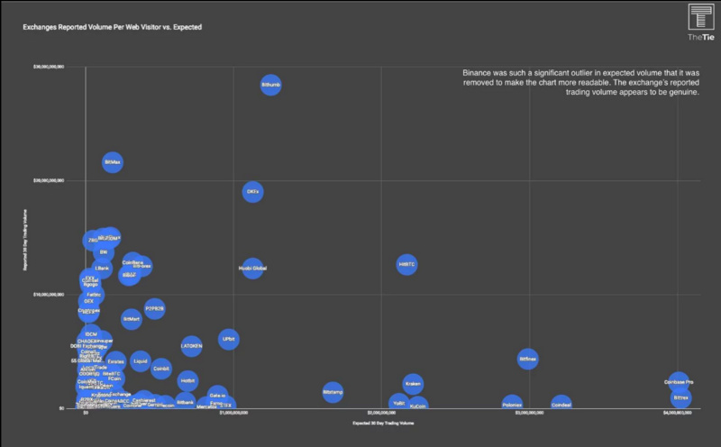 根据 TheTie 的一份报告,超过 86% 的比特币交易量是可疑的,而 75% 的交易所报告了非常可疑的交易量。例如,用户平均每次访问的价值为 13418 美元,预计 Bithumb 每月交易量应约为 12 亿美元,而 Bithumb 报告了超过 280 亿美元的交易量,这意味着他们报告的数值比预期的高出近 2,000% 。